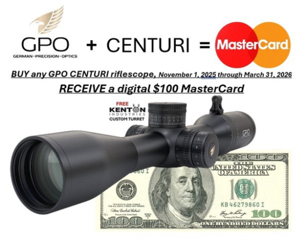Purchase any GPO CENTURI Riflescope between November 1, 2025, and March 31, 2026 then visit https://gpo-usa.com/category/promotions to download the rebate form or complete the application online.